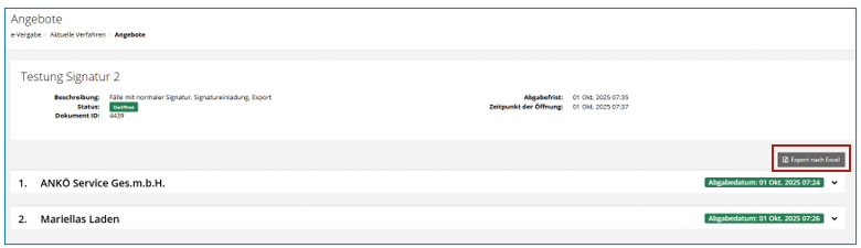 Zusätzlich zu den Bieterstammdaten und dem Angebotsinhaltsverzeichnis wird ab sofort auch die Signatur des Bieters im Excel-Export berücksichtigt.