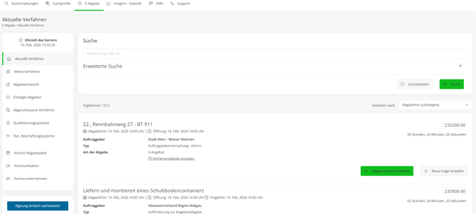 Geben Sie Ihr Angebot für das entsprechende E-Verfahren ab. Bis zum Ablauf der Angebotsfrist können Sie jederzeit Ihr Angebot zurückziehen oder durch ein neues ersetzen.