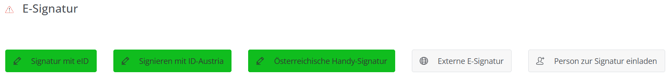 Unterstützt werden sowohl die Signatur per ID Austria als auch weitere qualifizierte elektronische Signaturdienste. Für ausländische Unternehmen ist es wichtig zu beachten, dass es sich bei Ihrer E-Signatur zwingend um eine qualifizierte elektronische Signatur handeln muss. Alternativ können auch weitere Personen über die Funktion „Person zur Signatur einladen“ Ihre digitale Unterschrift anbringen.