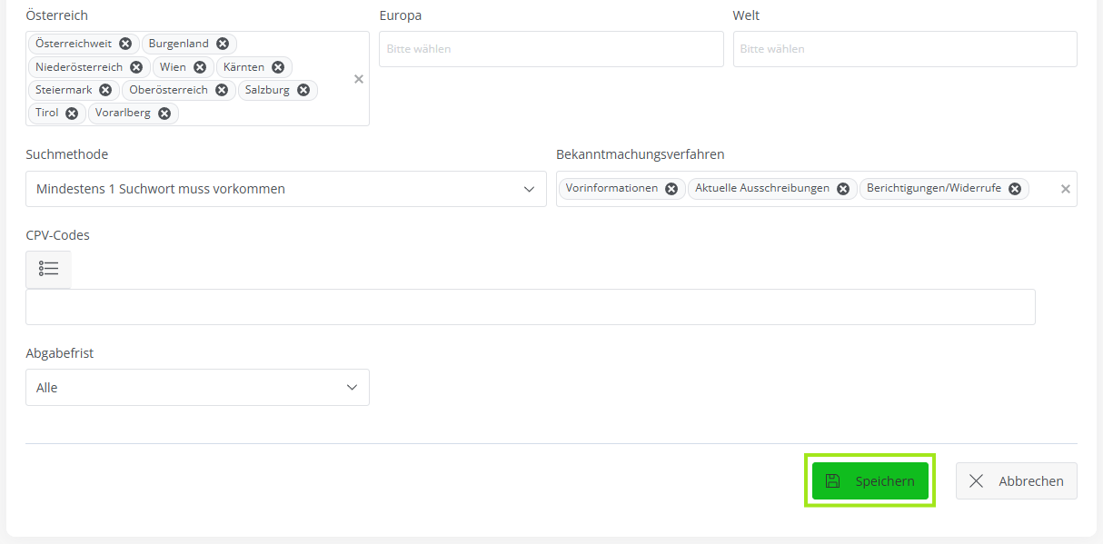 Sie kommen anschließend zu einem Formular, in dem Sie die gewünschten Änderungen vornehmen können. Wenn Sie mit den Änderungen fertig sind, speichern Sie diese abschließend durch klicken auf den "Speichern"-Button am Ende des Formulars: