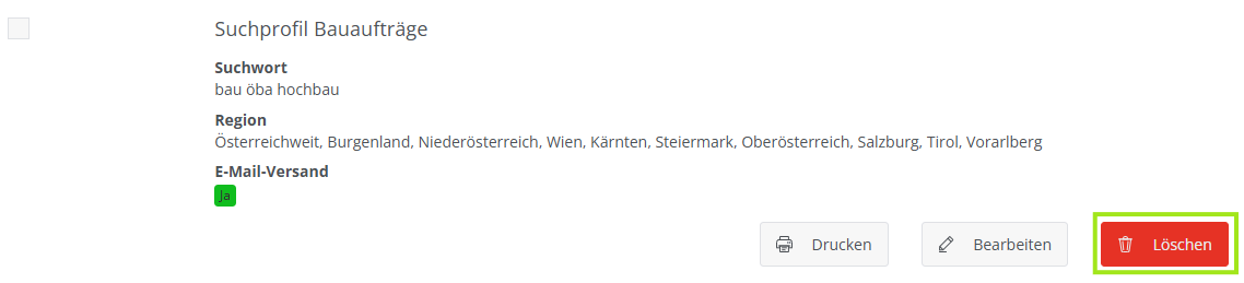 Um ein Suchprofil zu löschen, klicken Sie in der Suchprofilübersicht auf den "Löschen"-Button. Sie werden anschließend gebeten, die Löschung zu bestätigen. Bitte beachten Sie, dass Löschungen dauerhaft sind, und Ihre gelöschten Suchprofile nicht wiederhergestellt werden können. Um ein gelöschtes Profil wiederherzustellen, müssen Sie ein neues Profil mit gleichen Parametern anlegen.