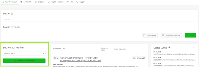 Hier empfehlen wir Ihnen jedoch, die Suchanfrage, die Sie so definieren, zumindest einmal über die Ausschreibungssuche auszuführen, um sicherzugehen, dass Sie damit auch wirklich die Ergebnisse erhalten, die Sie erwarten.