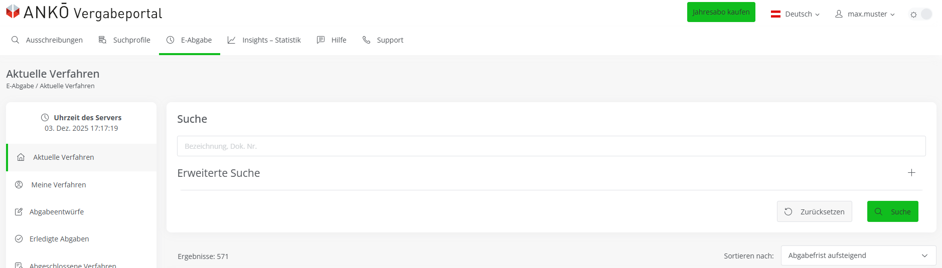 Zum einen können Sie aktuelle E-Abgaben recherchieren, die über den ANKÖ abgewickelt werden. Diese Funktion ist für alle registrierten Nutzer kostenfrei und dauerhaft verfügbar und bietet eine unkomplizierte Übersicht zu laufenden Vergabeverfahren.