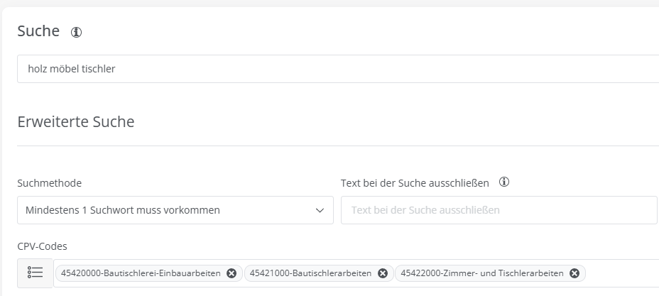 Beginnen Sie damit, in der Ausschreibungssuche nach möglichst allgemeinen Begriffen und CPV Codes in Ihrer Branche zu suchen. Für einen Tischler beispielsweise "holz möbel tischler" als Suchbegriffe und "45420000, 45421000, 45422000" als CPV Codes.