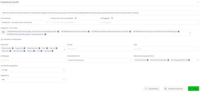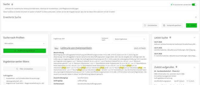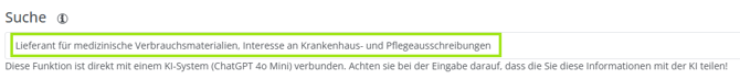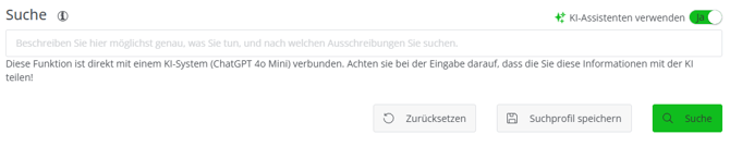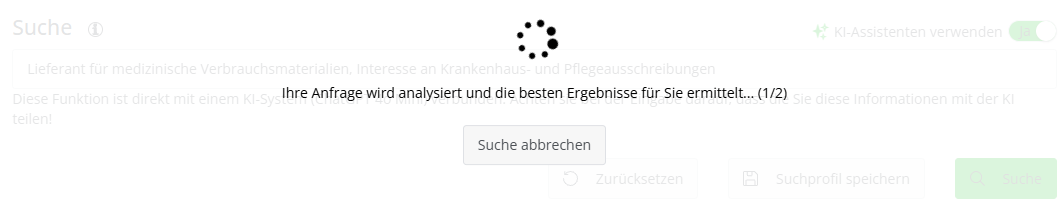 Mit einem Klick auf „Suche“ analysiert der KI-Assistent Ihre Eingabe. Anschließend werden automatisch Suchparameter generiert und die Suche nach passenden Ausschreibungen ausgeführt