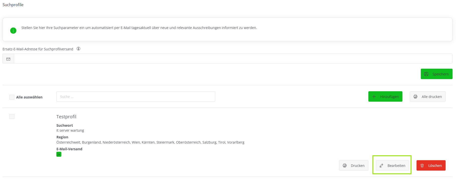 Der Versand von Suchprofil-Ergebnissen per E-Mail kann pro Suchprofil separat ein- oder ausgeschaltet werden.